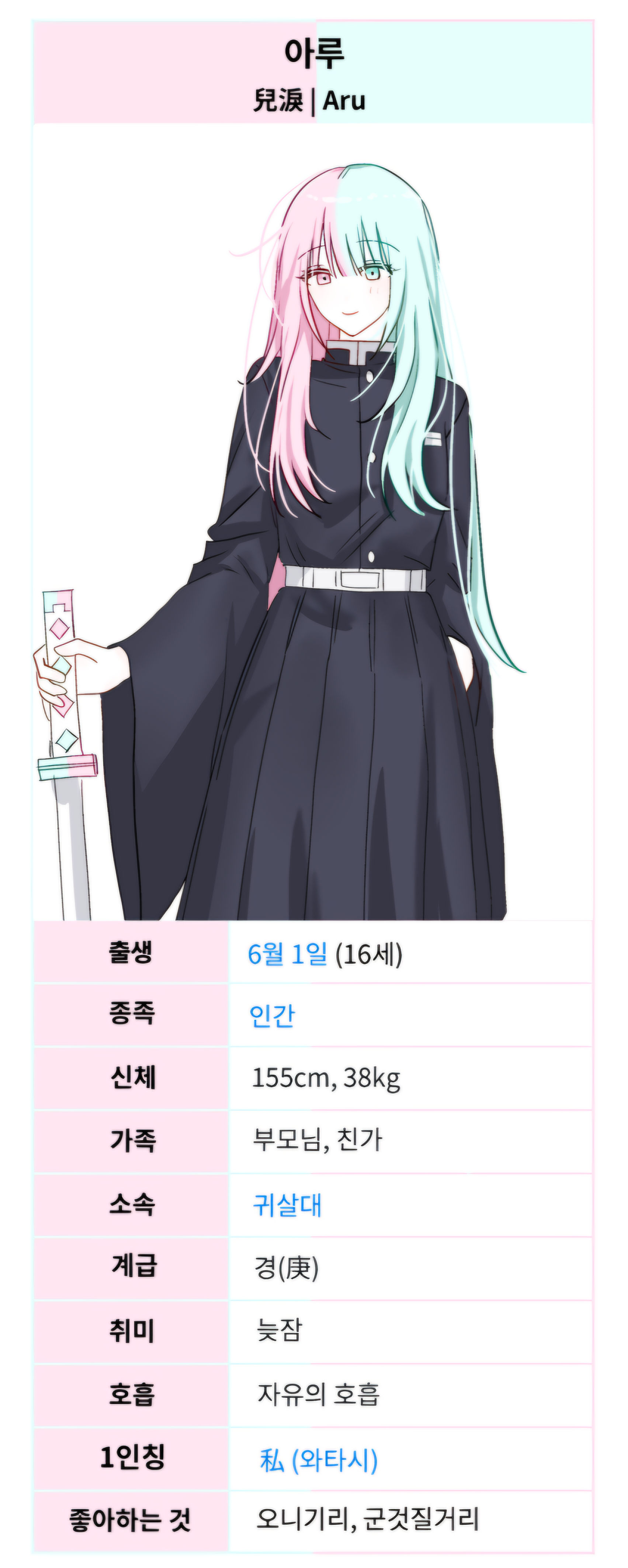 의지할 수 있는 사람. 아루가 귀살대에 들어가기 전부터 알고 지내던 사이였으며 이름이 없는 아루에게 이름을 지어준 것도 루아라고 한다. 서로가 서로를 가족이라고 생각하며 루아에게 많은 것을 배웠다.